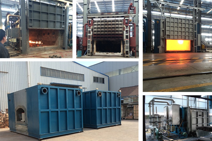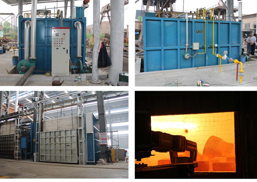 蓄熱式天然氣節(jié)能鍛造爐爐底單位鋼錠放在爐底上面的耐熱鋼滑道上,由設(shè)置在裝面積產(chǎn)量約為250一400kg/(mZ·h),單位熱耗約為料端的推鋼機(jī)向出料方向推進(jìn),加熱好的鋼錠多數(shù)由4.0~5.SGJ/t。設(shè)置在出料端側(cè)面的出鋼機(jī)推出爐外。推、出鋼機(jī)的推臺車式鍛造爐用于重型鋼錠的鍛前加熱。爐料力按摩擦系數(shù)為1.。計(jì)算。由吊車或?qū)S脵C(jī)械裝在臺車上面的墊鐵上,墊鐵高度爐底單位面積產(chǎn)量約為15。